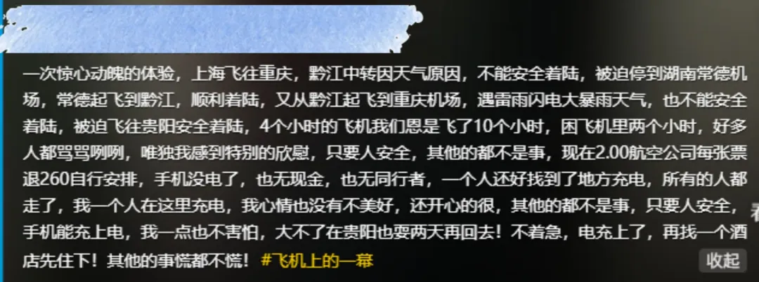 目前,发帖的网友也已经删帖。还有其他网友在社交平台表示,4小时的飞机硬生生飞了10小时,期间还在飞机里被困了2个多小时。不过机组人员都靠谱,保证了大家的安全,还补贴了住宿费、提供了食物和水。