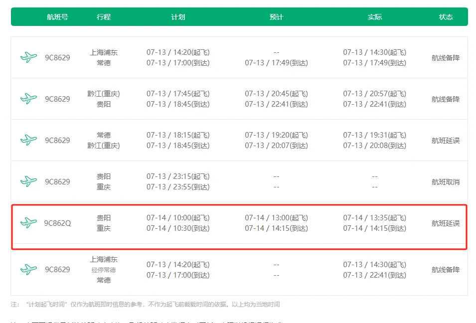 7月14日下午,有媒体记者就该航班异常动态致电春秋航空客服,工作人员称受天气影响,13日,该航班确实陆续有在常德、贵阳备降,后续从贵阳到重庆进行了补班,显示已于14日下午2时15分到达重庆。