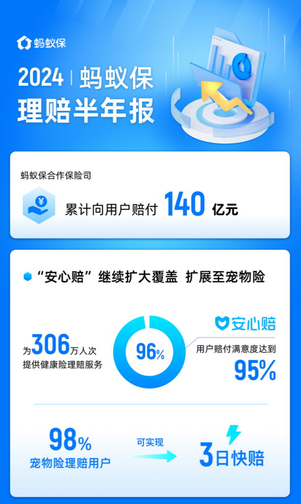 7月15日,互联网保险代理平台蚂蚁保发布《2024年蚂蚁保平台理赔服务半年报》。截至6月30日,合作保险机构通过平台累计向用户理赔140亿元,同比增30%。