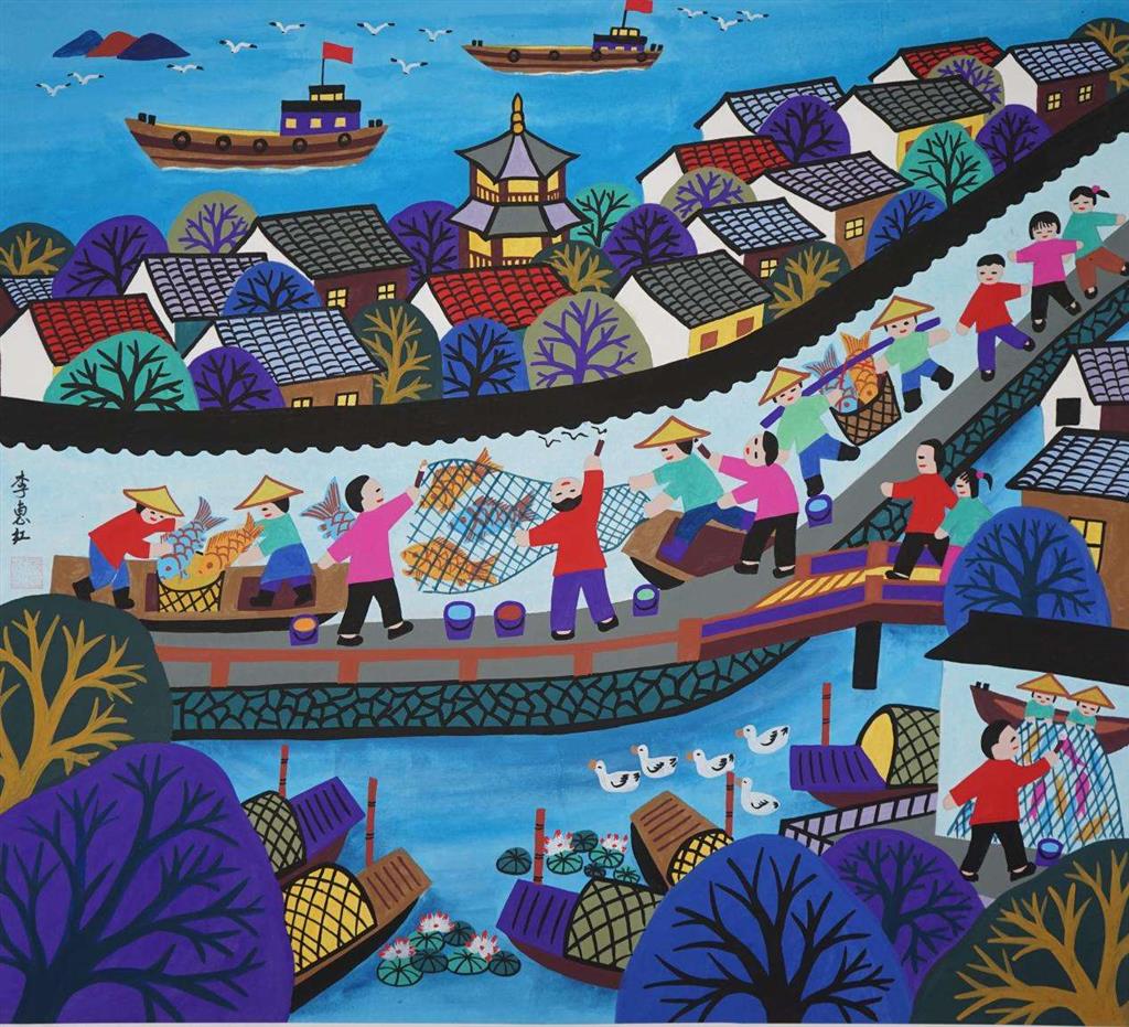 其中,画家李惠红用金山农民画的形式,展现了山阳镇渔业村深厚的海渔文化底蕴和金山滨海旅游的繁荣。“金山嘴渔村”就位于渔业村,是上海市沿海陆地最早、保存最为完整的渔业村落,也是上海最后一个“活着”的渔村,被评为“中国最美休闲乡村”。画面中,满目繁茂苍翠,万物轻韵流淌,近处的水面上盛开着莲花,远处飞着海鸥,海面开着渔船,桥上游客纷纷,淡墨渲染着水乡渔家的温情,仿佛步入一个色彩斑斓的梦境。