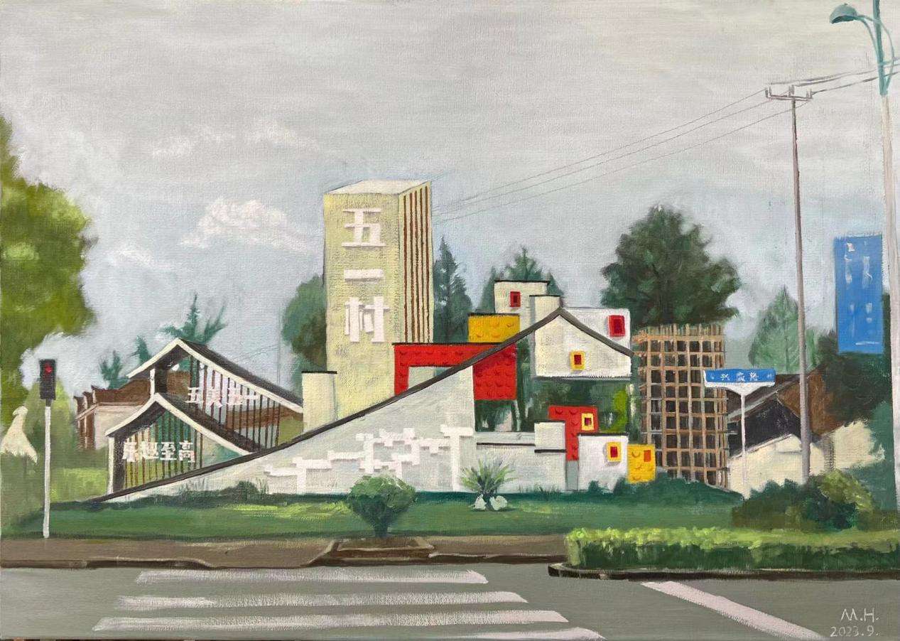 画家马慧则用油画的形式,创意融合乐高积木元素,描摹了枫泾镇五一村的标志村牌。五一村曾是传统农业大村,自上海乐高乐园度假区落地五一村兴豪路以东片区,五一村便以乐高乐园为契机寻求转型升级,乐高乐园也为村子发展带来了新机遇。画面中,亮丽的乐高积木点缀在独具江南韵味的白墙黛瓦之上,既引人注目又与周围景色相得益彰,彰显了文旅融合为乡村振兴赋彩。