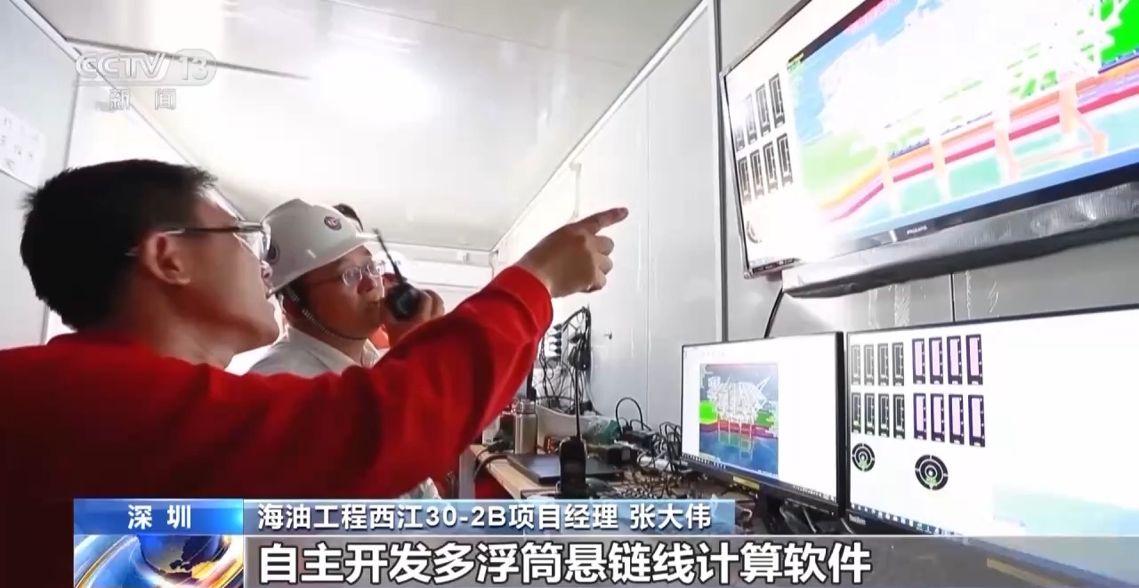 海油工程西江30-2B项目经理张大伟:项目团队应用数字化工具进行三维建模和计算分析,精准设计浮托技术方案,自主开发多浮筒悬链线计算软件,对系泊布置进行反复优化,浮托作业过程中,通过多拖轮联动控船,实现上部组块一次精准就位。
