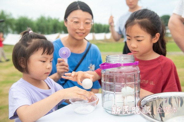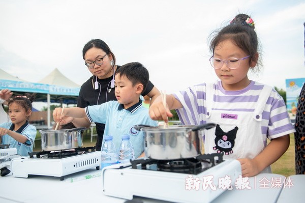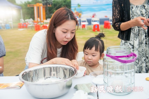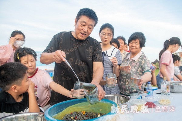 腌制咸鸭蛋、黄泥螺、盐津豆、酸白菜……7月15日至7月18日,金山区漕泾镇开展“可盐可甜 乐游水COOL”六月初六晒盐节系列活动,吸引了100余组家庭参加。在漕泾镇郊野公园的橘岛乐园,家长们和孩子一起动手,纷纷展示自己的绝活,有的小心翼翼地将鸭蛋涂上食盐和白酒,再将其包裹好放置密封罐中;有的给腌制好的黄泥螺调味增鲜;还有的则亲自上阵,用筷子炒制盐津豆,亲子间合作默契,争先尝试。本次活动旨在通过亲子制作美食,感受和传承以海为生、以盐为业的先民们传承下来的艰苦奋斗、敢于拼搏的宝贵精神。