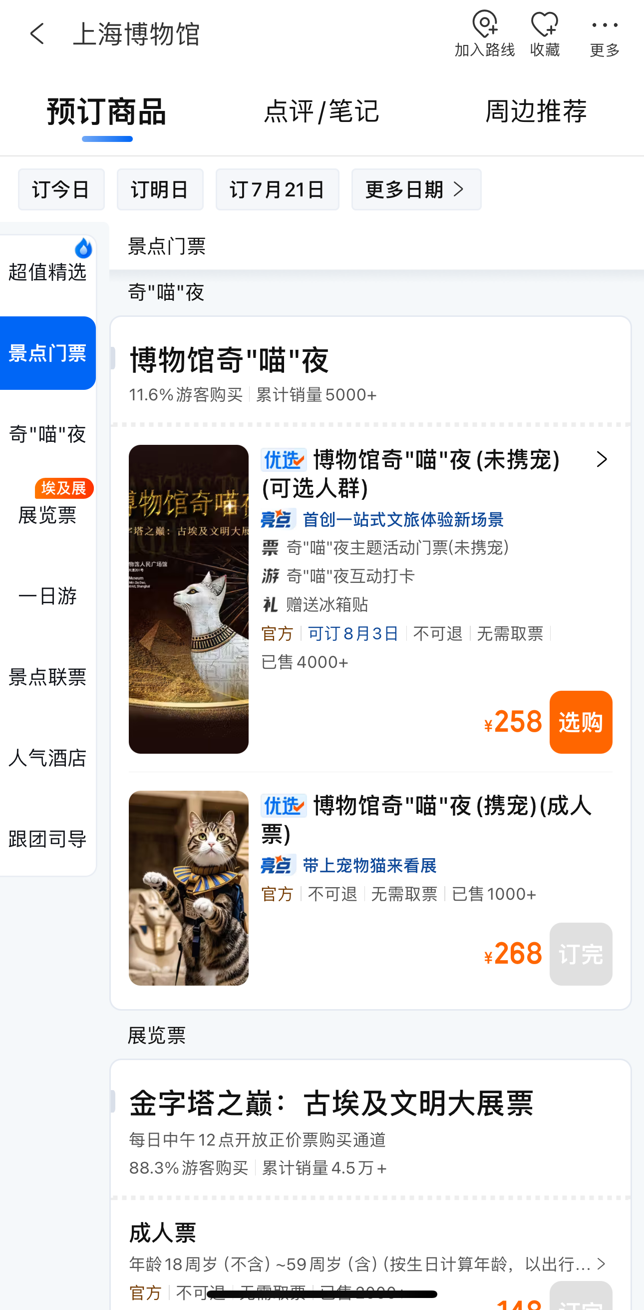 随着7月19日“金字塔之巅:古埃及文明大展”对公众正式开放,与该展览“特配”的“博物馆奇‘喵’夜”活动,即观众可携带宠物猫一同参观的展览场次也开始售票。据了解,奇“喵”夜门票于7月19日12:00启售,由携程旅行网统一售卖,每场观众2000人,其中携宠票200张,每张携宠票仅限带一只宠物猫入场。携宠票每张268元,普通成人票258元,未成年人票(18周岁以下)150元。
