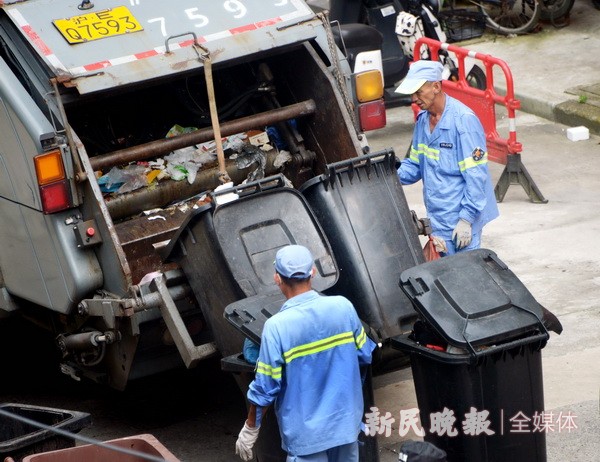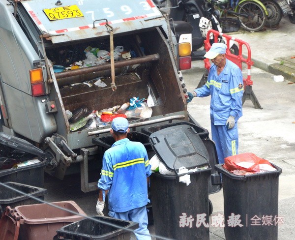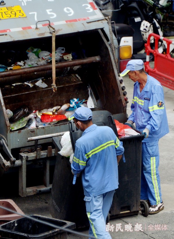 入伏以来,连续高温炙烤申城,气温都在38-39摄氏度徘徊,盛夏酷暑也使产生的生活垃圾比平时增加了几倍,环卫工人在热浪“烤”验下奋战高温,增加了垃圾清运次数。图为昨天下午,杨浦区国定路一小区,汗流浃背的环卫工人在清运生活垃圾。