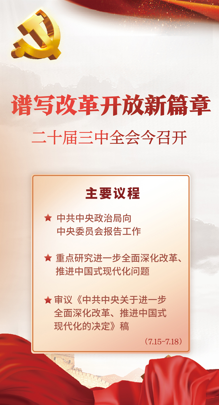 7月15日至18日,中国共产党第二十届中央委员会第三次全体会议胜利举行。在推进中国式现代化的新征程上,中国改革开放矗立起新的里程碑。全会通过的《决定》,是新时代新征程上推动全面深化改革向广度和深度进军的总动员、总部署,必将为中国式现代化提供强大动力和制度保障。
