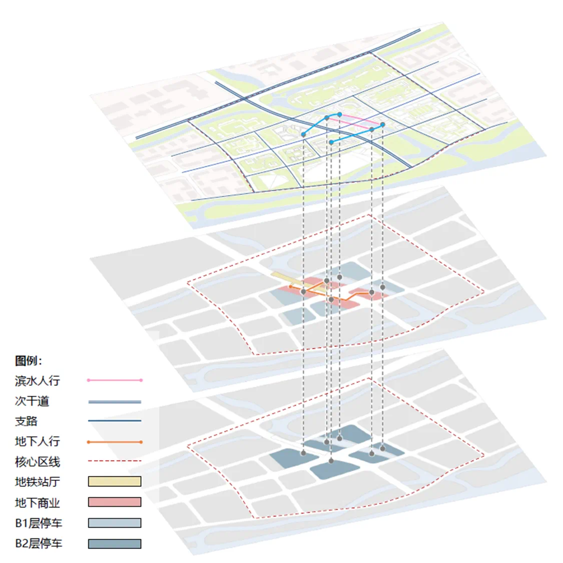 此次规划调整加强了核心区轨交站点与周边地下空间的一体化开发,将采用互联互通的立体开发模式,实现地块间的无车化慢行连通,提高轨交站点步行可达性,同时加强站点与公共服务设施及滨江绿地的步行联系。核心区将形成服务研发二期片区、辐射大紫竹与大零号湾的生产生活配套中心,实践“城市客厅”的多功能全服务体验;同时,对樱桃河两岸进行协同开发,提升核心区的复合功能和城市风貌。