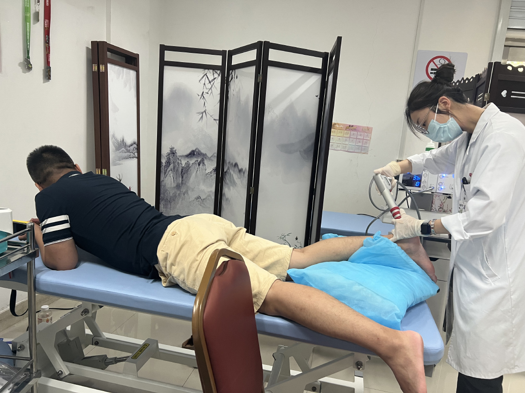 跑步爱好者韩先生因跟腱疼痛,前来马拉松康复门诊尝试冲击波治疗仪缓解跟腱疼痛。