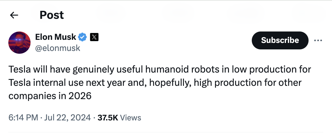 7月22日,特斯拉CEO埃隆·马斯克在旗下社交媒体X上表示,“真正可用的特斯拉人形机器人将在明年实现小规模生产,并被用于特斯拉内部,希望能够在2026年实现大规模量产,并向其他公司提供。”