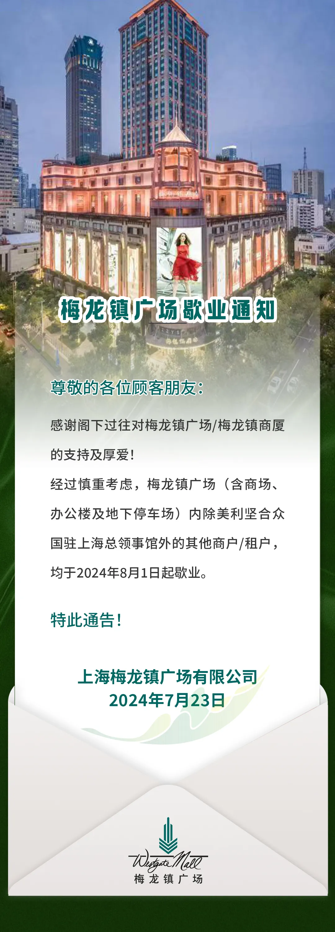 据“梅龙镇广场”微信公众号消息,上海梅龙镇广场(含商场、办公楼及地下停车场)内除美利坚合众国驻上海总领事馆外的其他商户/租户,均将于2024年8月1日起歇业。