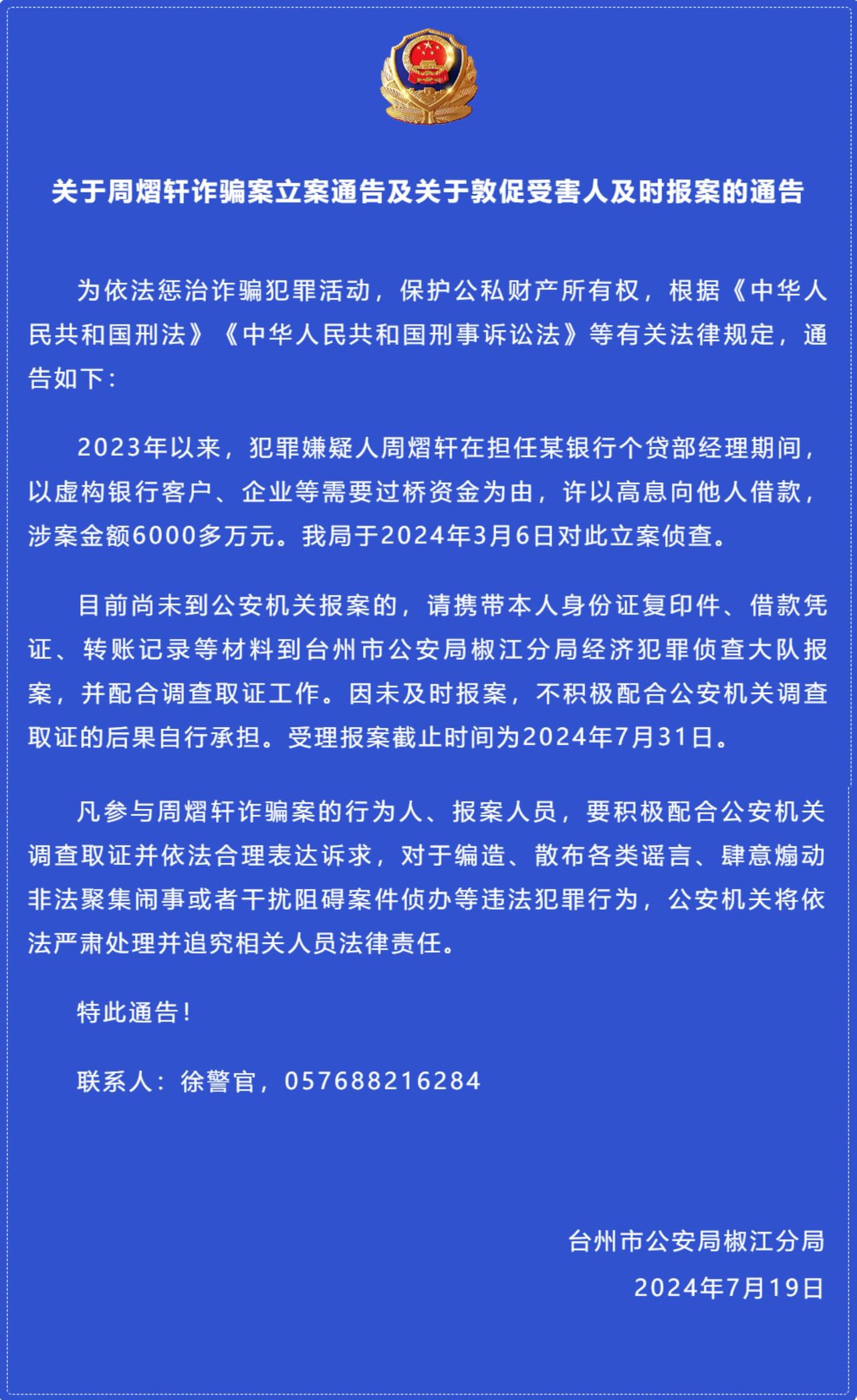 7月19日,据公众号“椒江公安”通告,2023年以来,犯罪嫌疑人周熠轩在担任某银行个贷部经理期间,以虚构银行客户、企业等需要过桥资金为由,许以高息向他人借款,涉案金额6000多万元。台州市公安局椒江分局已于2024年3月6日对此立案侦查。