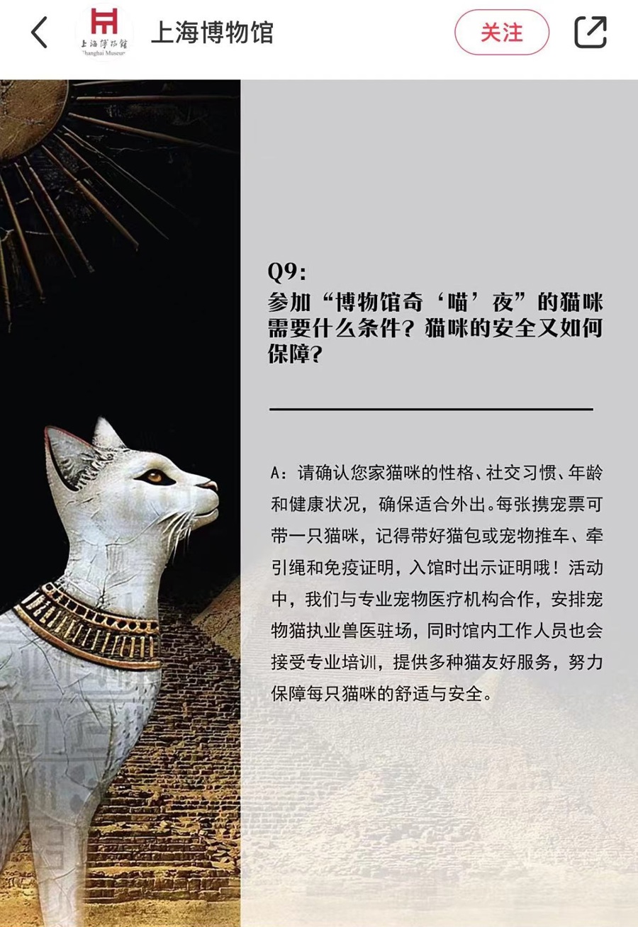 与此同时,上博也提醒观众确认自家猫咪的性格、社交习惯、年龄和健康状况,确保适合外出。携宠参观的观众需要到正规宠物医院开具宠物猫的免疫证明并在入馆时出示,自备猫包或宠物推车,以及牵引绳+胸背等控制宠物的物品,在展厅内也尽量避免让宠物猫聚集。