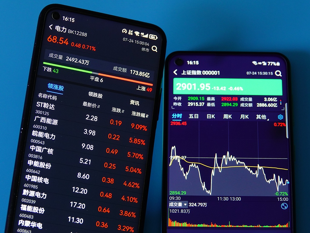 2024年7月24日,湖北宜昌,股民展示A股沪指、电力板块收盘行情。视觉中国 图