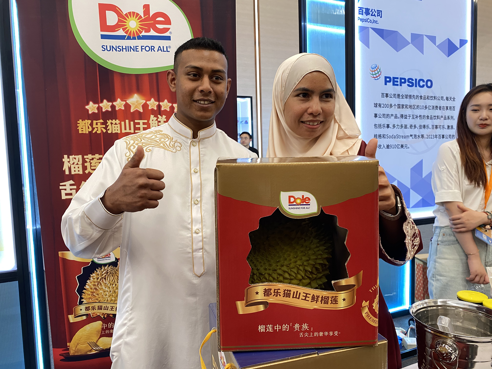 在对接会展台,来自马来西亚的猫山王鲜榴莲揭开“盖头”。都乐中国市场总监王娜说,都乐将携马来西亚猫山王鲜榴莲亮相第七届进博会,该款新品的主要特色是微苦回甘、价格亲民,“通过进博会的平台,获准进入中国的鲜果已接近上百个品种,前六届进博会我们首发了巴西甜瓜、比利时红啤梨等11款产品。”