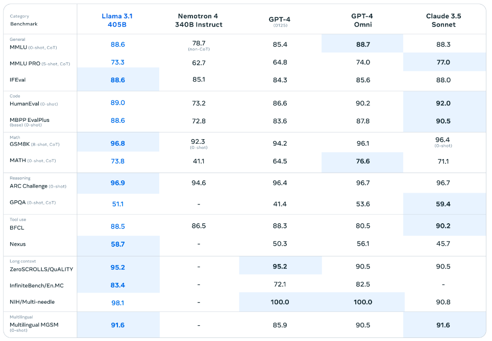 Llama 3.1 405B版本在基准测试集中取得优异成绩。来源:Meta