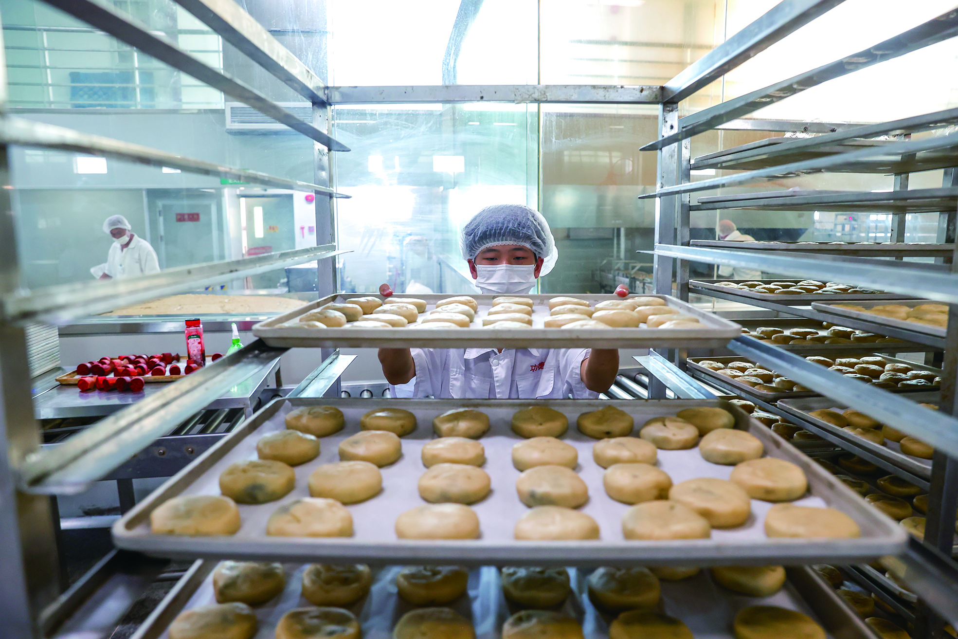 走进生产车间,只见工人们正熟练地制作月饼。有的称量原料,有的和面、包裹馅料,还有的把月饼团子压制成型后进行盖章,然后送入烤炉进行烘烤。在烤炉另一头,一盘盘色泽金黄的现烤月饼依次出炉,散发出阵阵酥香味。