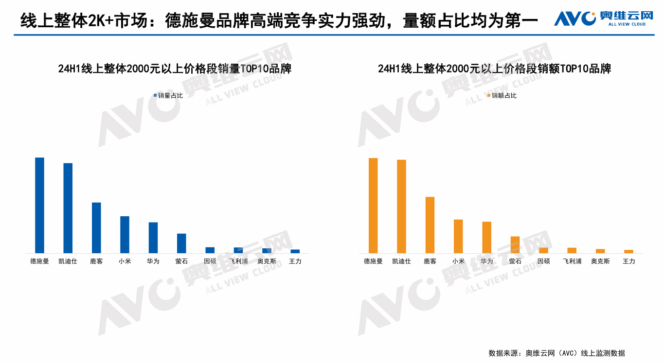 对此,聚焦中高端市场的德施曼,在上述品类及中高端市场中均保持了重要地位,在线上2000元及以上市场中,德施曼的零售量、零售额占比均排在首位。