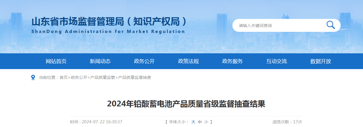 【山东】2024年铅酸蓄电池产品质量省级监督抽查结果