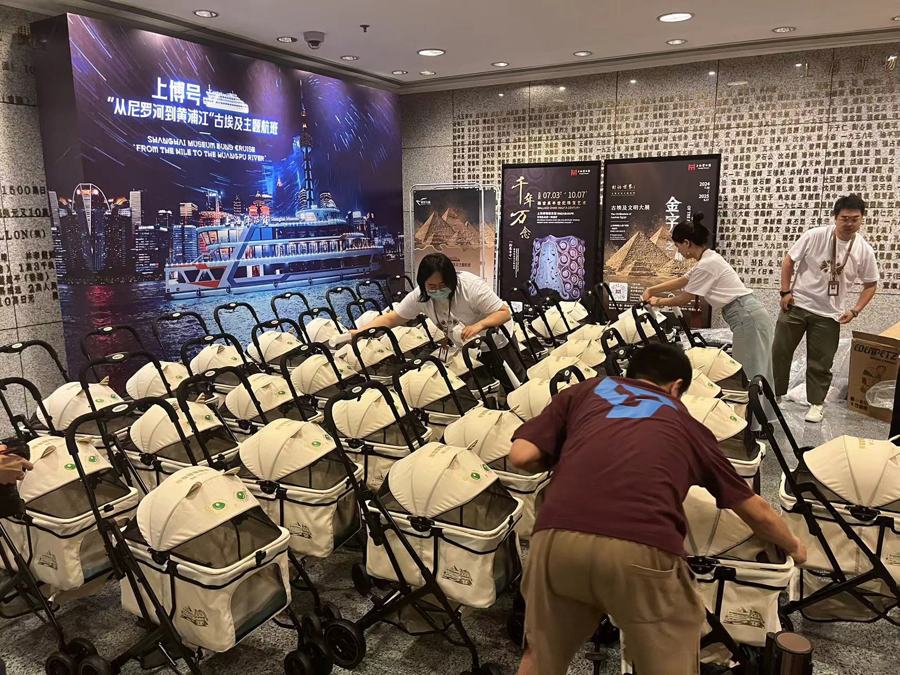 18时许,火女士的猫咪完成检查,一旁的志愿者推来一辆印有“博物馆奇‘喵’夜”、顶棚设计成猫造型的宠物推车,协助火女士将猫咪从猫包中转移至推车里并推进博物馆,同时火女士则携带随身物品通过安检。18时03分,火女士与自己的宠物汇合,上海博物馆首只“猫观众”顺利入场。“还是蛮开心的。”火女士介绍,自己听闻上博推出这项“携宠观展”活动后第一时间购票,也了解了相关规定和活动内容,“最期待二楼的猫爪互动”。