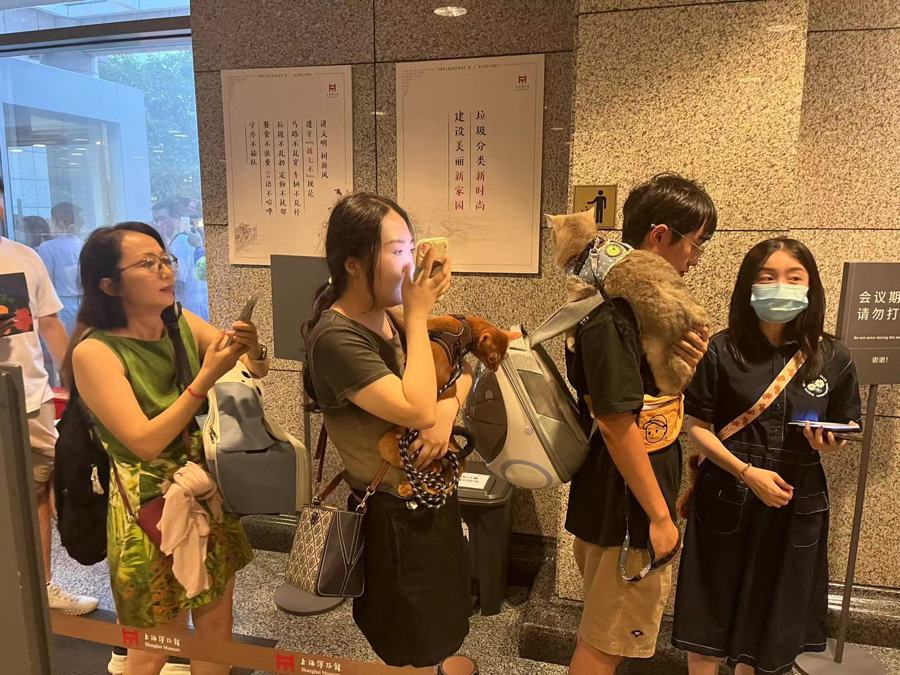 首场活动如何通过考验?时间回到活动开始前半小时。下午17时30分,记者在上博人民广场馆南门外看到,等候入场的观众已排起长队;另一侧多位携宠而来的市民也已在专用通道处等候,他们怀中的猫咪吸引了不少路过的观众驻足拍照。
