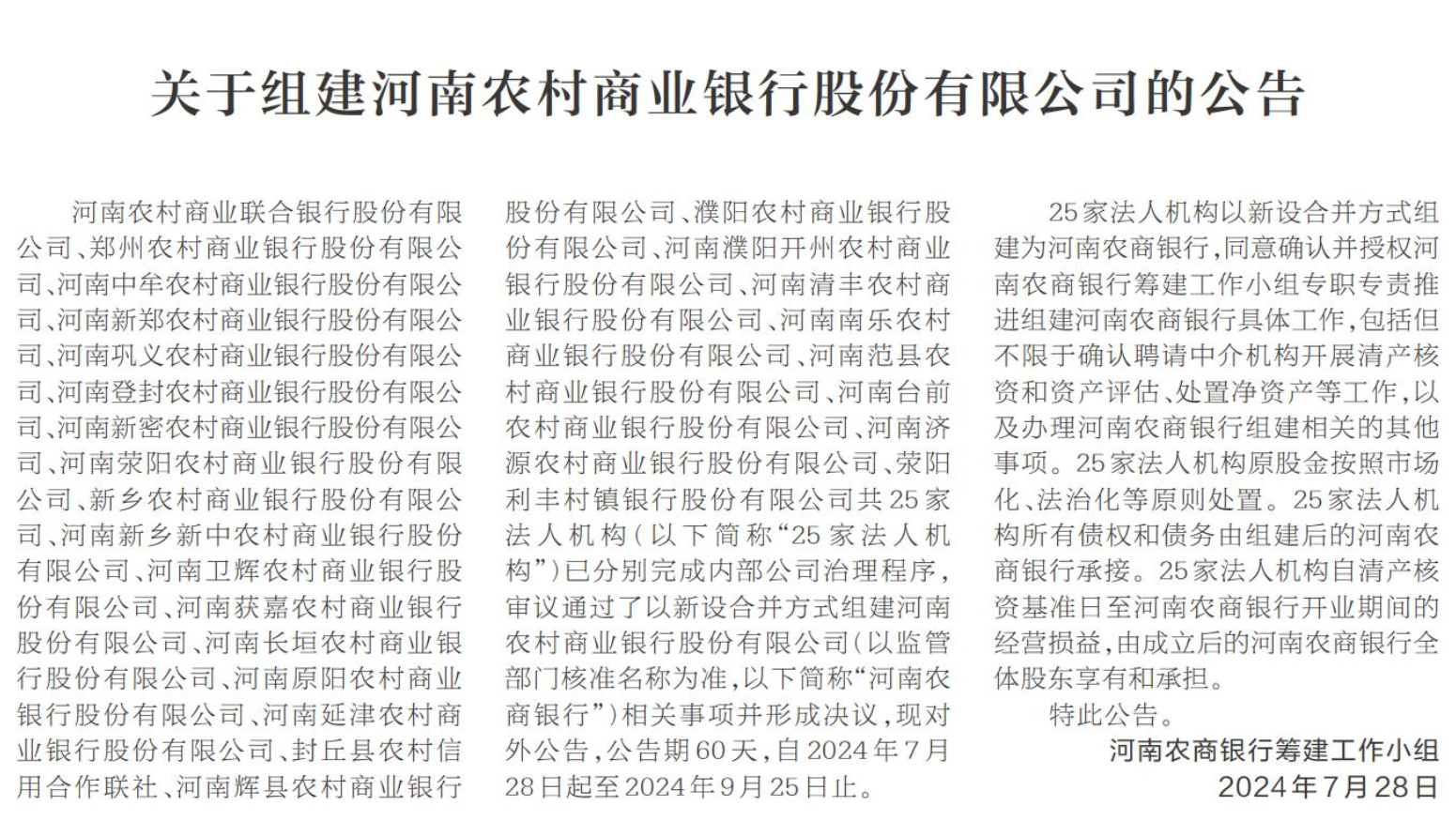 7月28日,河南农商银行筹建工作小组公告称,河南农村商业联合银行股份有限公司(下称“河南农商联合银行”)、郑州农村商业银行股份有限公司等25家法人机构已分别完成内部公司治理程序,审议通过了以新设合并方式组建河南农商银行(以监管部门核准名称为准)相关事项并形成决议。25家法人机构以新设合并方式组建为河南农商银行,同意确认并授权河南农商银行筹建工作小组专职专责推进组建河南农商银行具体工作,包括但不限于确认聘请中介机构开展清产核资和资产评估、处置净资产等工作,以及办理河南农商银行组建相关的其他事项。25家法人机构原股金按照市场化、法治化等原则处置。25家法人机构所有债权和债务由组建后的河南农商银行承接。25家法人机构自清产核资基准日至河南农商银行开业期间的经营损益,由成立后的河南农商银行全体股东享有和承担。