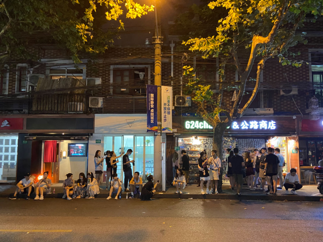 谁第一个坐马路牙子已经无法追溯,长乐路第一家酒吧——长乐624的老板娘英姐回忆,大概是2019年起情况变得严重,有些扰民。有一段时间,她非常焦虑,既要处理店里的工作,还要留意店外的客人,比如有人喝多了,有人占据了机动车道。“一到(晚上)十点钟人越来越多,看上去密密麻麻全是人,但这些人全是你的顾客,想管又管不了。我那个时候每天得喝一杯。后来警察来了,我整个心就放下来了,警察的说服力比我强。”