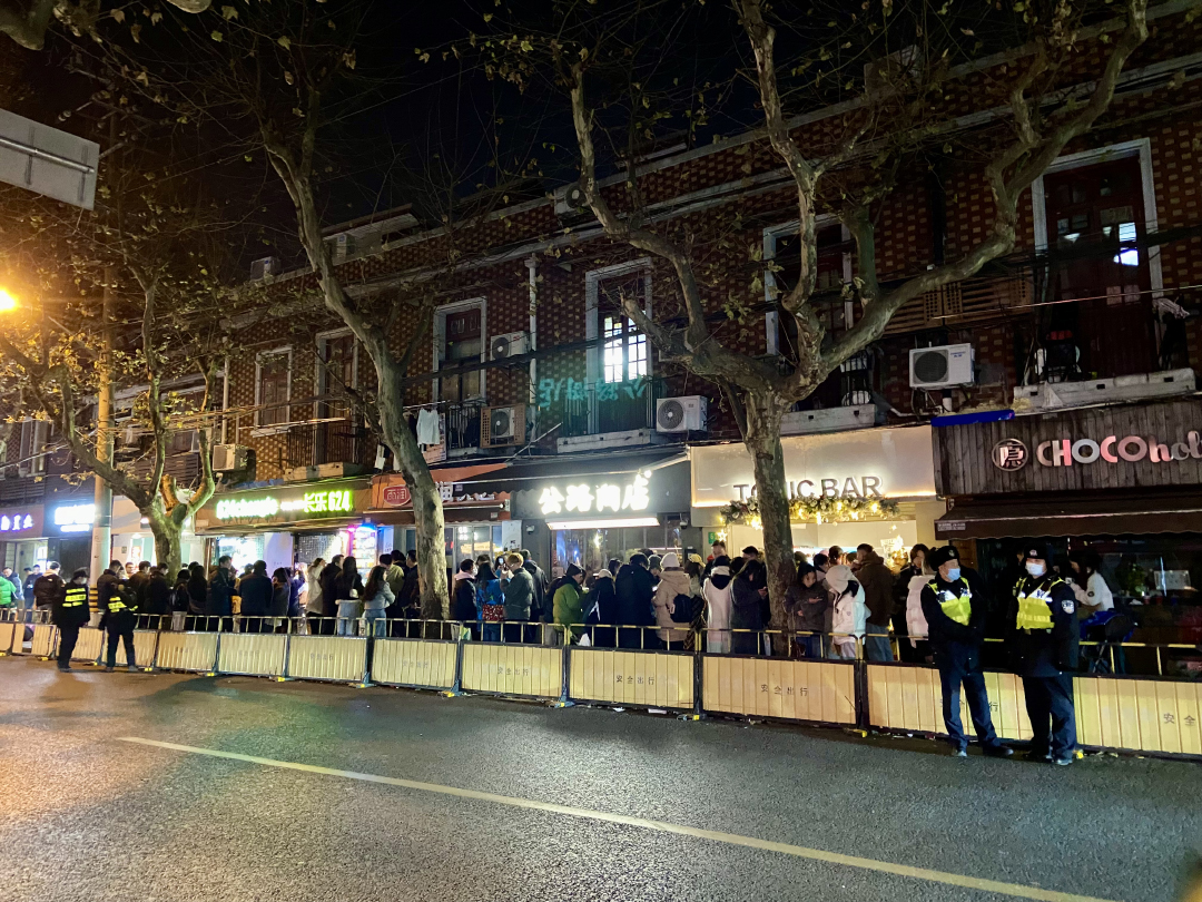 年轻人扎堆喝酒,长乐路一度拉起围栏,隔离人行道和机动车道,该图摄于2023年12月23日。