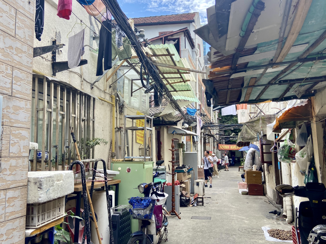 穿进居民里弄,晾竿电线上还挂着衣服,废品回收随处可见,老式手机收音机、喜字印花的碗碟瓶罐、复古挂画旧报纸摊在阳光下,偶尔有人骑着电动车穿过,彻底搬完的房屋门上贴着“空”字封条。
