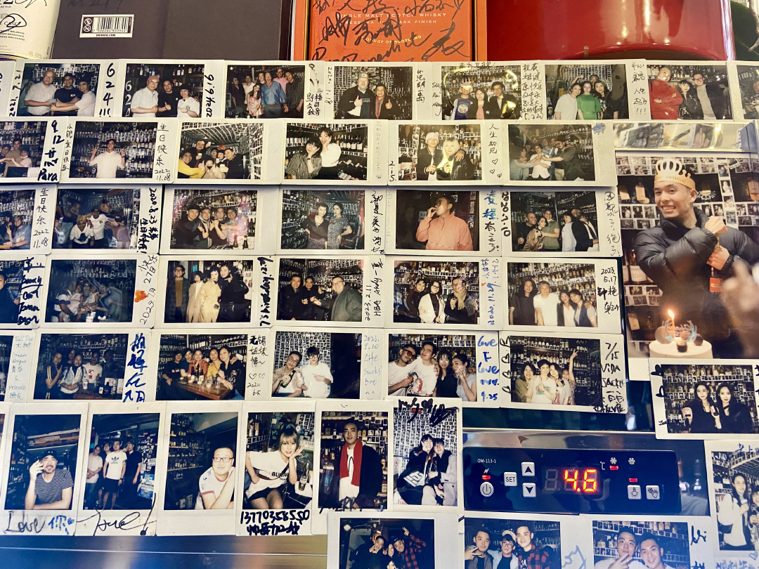 7月12日下午5时,老黄在店里分拣照片。这些年,店里的客人留下一万多张拍立得,贴满长乐路店面的墙壁、酒柜、空调、天花板,甚至吊灯。店铺搬迁,这些关于友情、爱情的记录也都被带到新店,老黄把照片按时间分类张贴,方便客人再来寻找回忆。