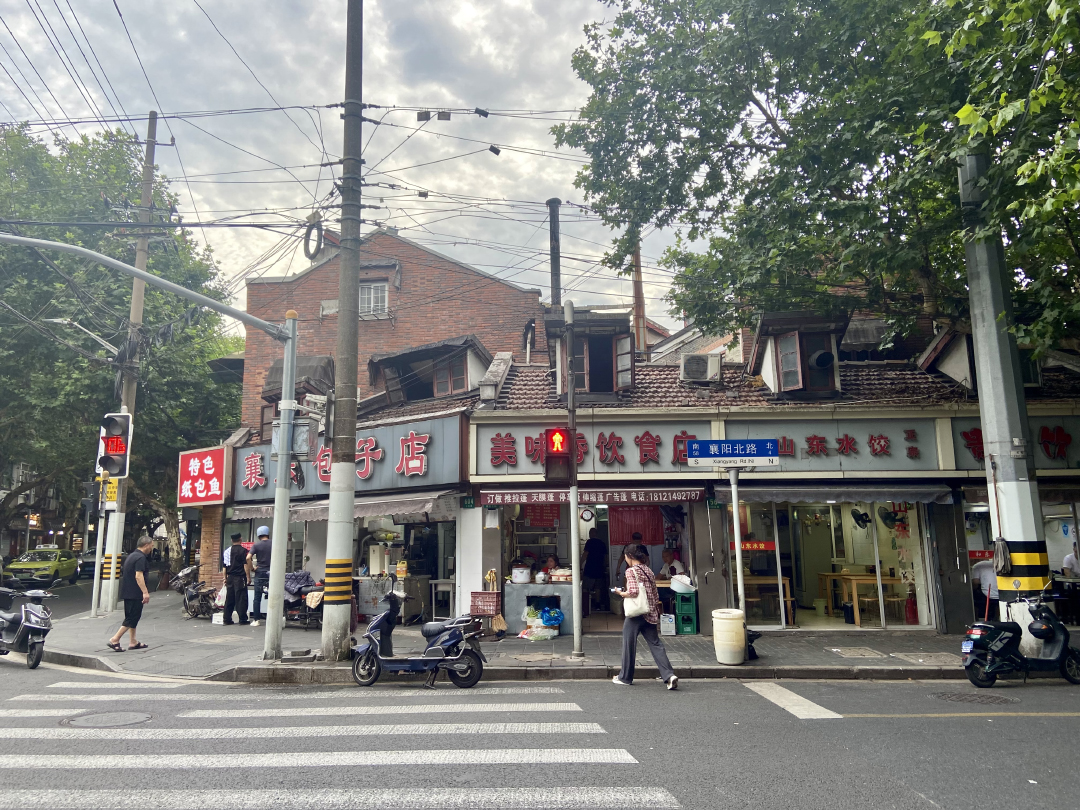 从长乐路转入襄阳北路,街道风格陡转,长乐路的店招是Chocoholic、Tonic Bar、鸟啸酒场、Gelato Manuela、周休七日、又喜商店……而襄阳北路的店招是襄乐包子铺、山东水饺、和乐点心店、福建千里香馄饨、黄焖鸡米饭、红烧牛肉面。