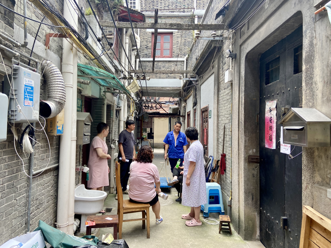 7月18日中午,襄阳北路四十四弄,老邻居们正在聊天。本文图片均为澎湃新闻记者 陈悦 图