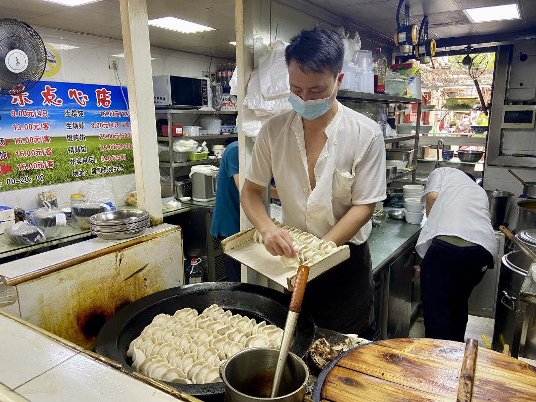 叶大旺26年前还是个单身小伙的时候就来到襄阳北路这家店,跟着老板做了4年,后来自己接手店面,把“锅贴”这个招牌做出了口碑,常来的食客大多是回头客。也是在这里,他结识了隔壁店的姑娘韩家美,两人一起奋斗至今。