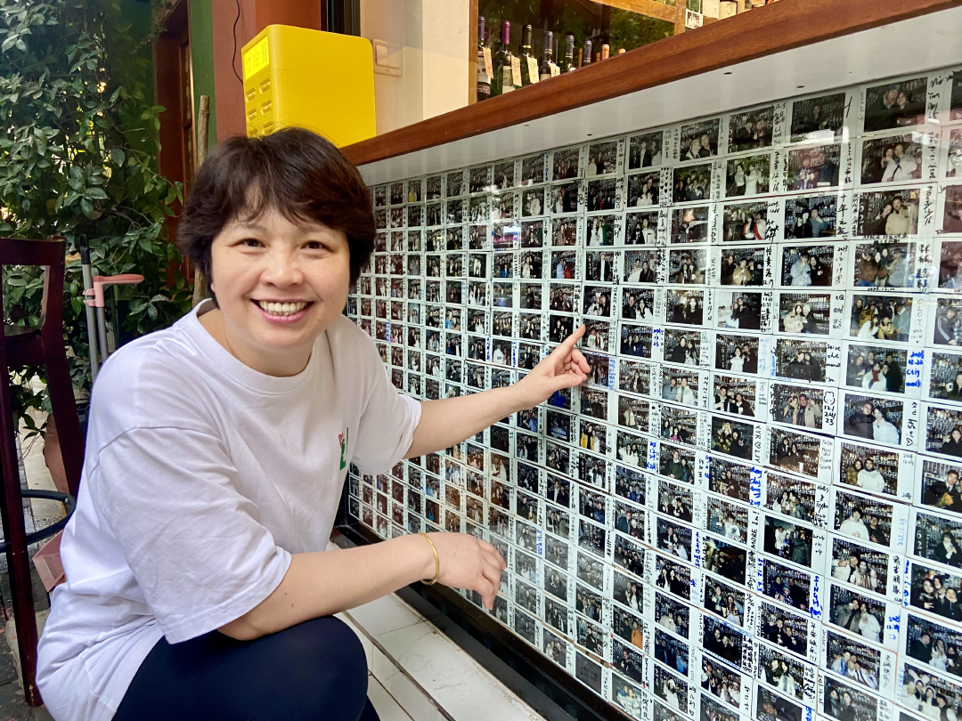 客人留下的拍立得照片在长乐624新店贴出,英姐正在介绍。