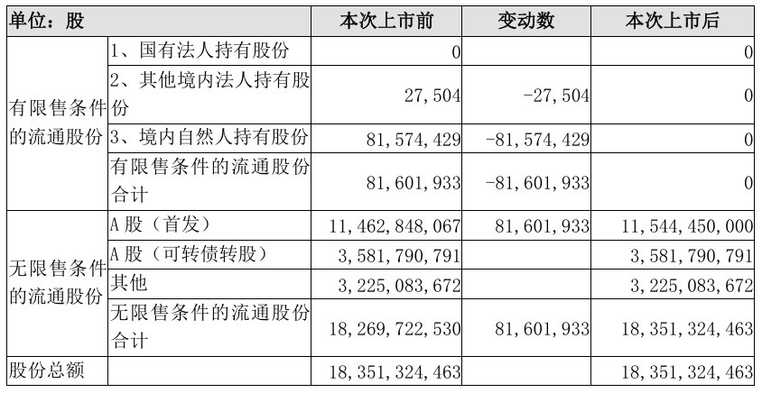 届时,普通股股本结构将变动如下: