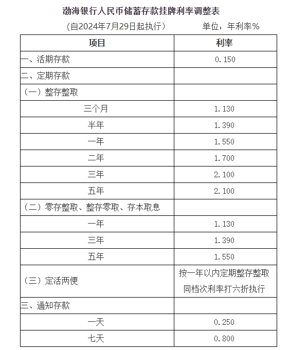 渤海银行:今日调整人民币存款挂牌利率!