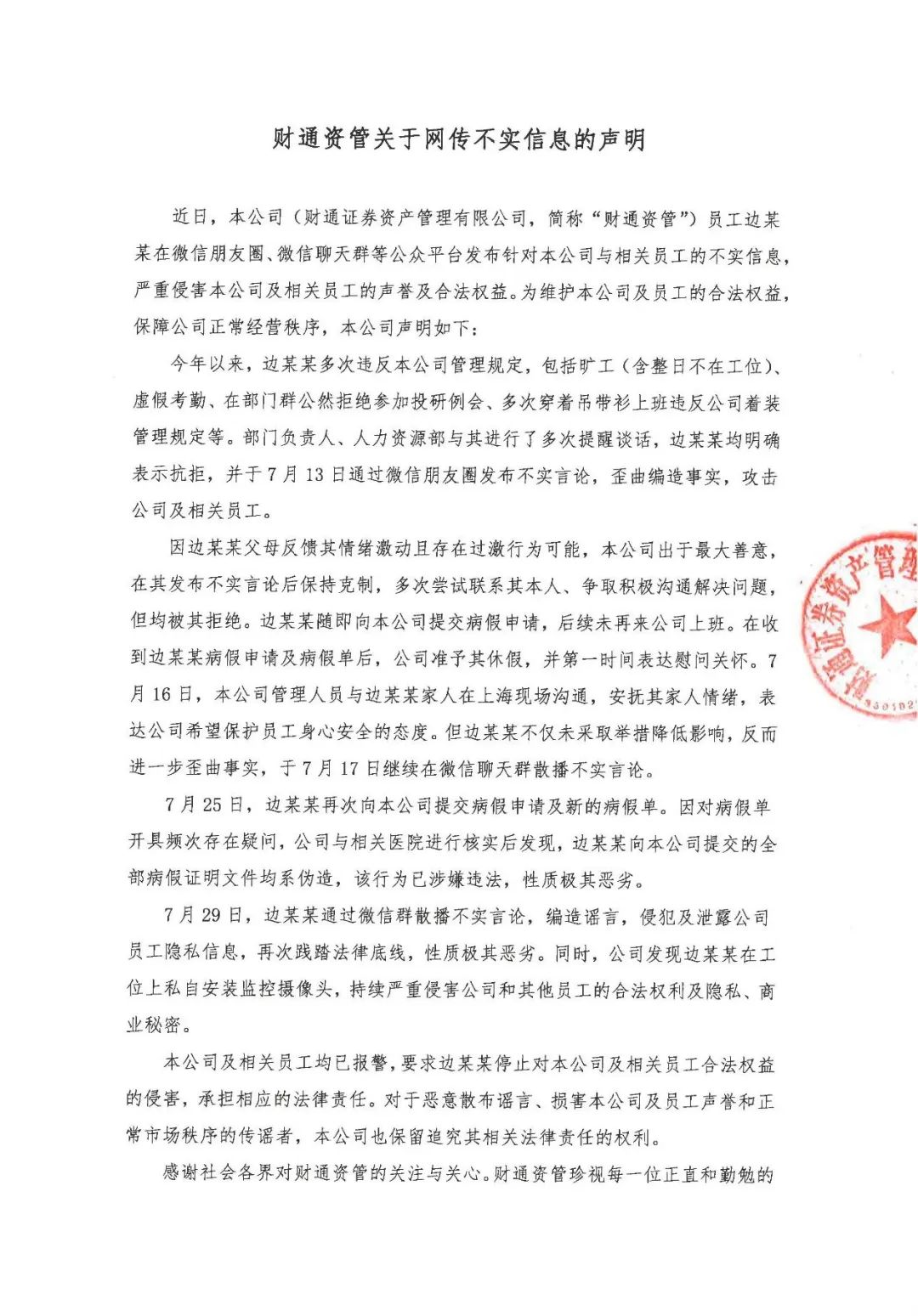 当天,“财通证券资管”微信公众号发布“财通资管关于网传不实信息的声明”表示,员工边某某在微信朋友圈、微信聊天群等平台发布不实言论,歪曲编造事实,攻击公司与相关员工。