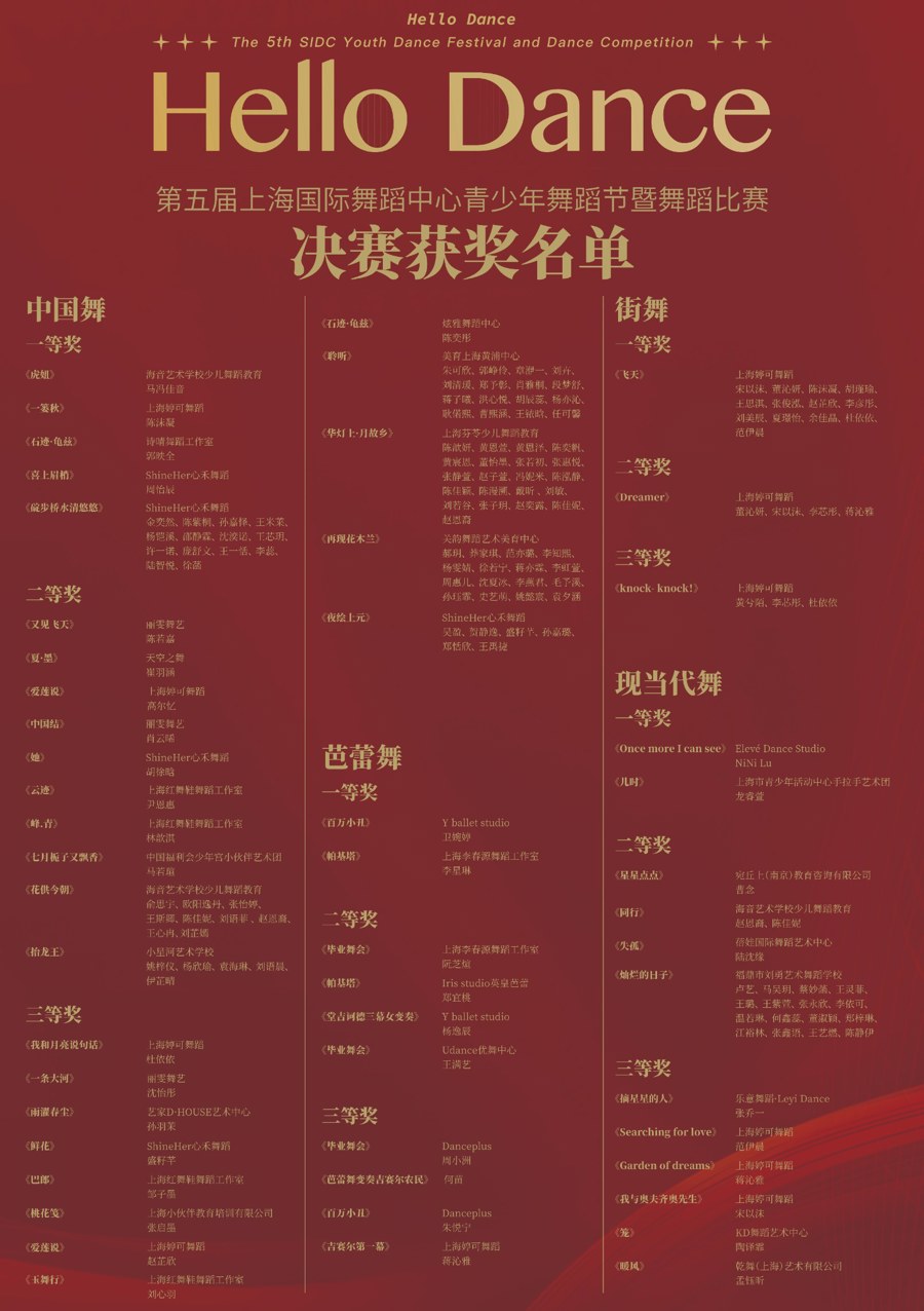 7月28日晚,第五届上海国际舞蹈中心青少年舞蹈节暨舞蹈比赛(青舞节)落下帷幕。青舞节面向全国7-15岁青少年舞蹈爱好,舞种涵盖中国舞、芭蕾舞、现代舞和街舞等,通过开展舞蹈比赛、大师班、训练营等一系列活动,为青少年提供了一个实现舞蹈梦想的舞台。