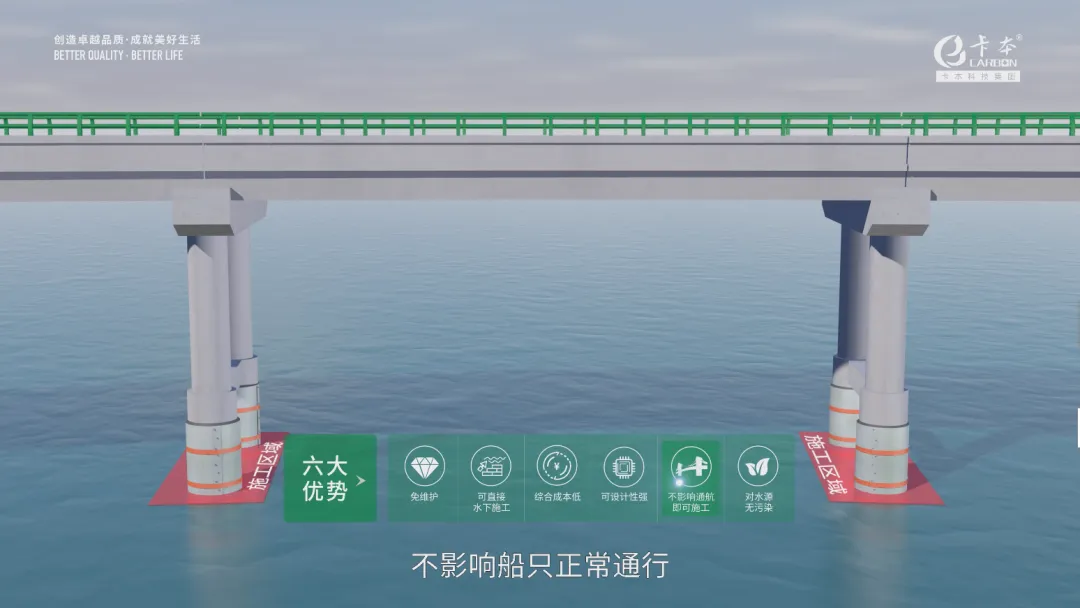 在我国建筑维修加固行业中,水下工程结构的保护一直以来都较为棘手。针对受损墩柱、桩基等水下结构的修复加固,传统围堰法需要搭建围堰、施工过程繁琐、施工周期长,综合成本高,在实践应用上并不能很好满足需求。此外,由于施工所选用的材料,必须与原建筑材料相同,难以从根本上提升结构的防腐蚀、防破坏能力。