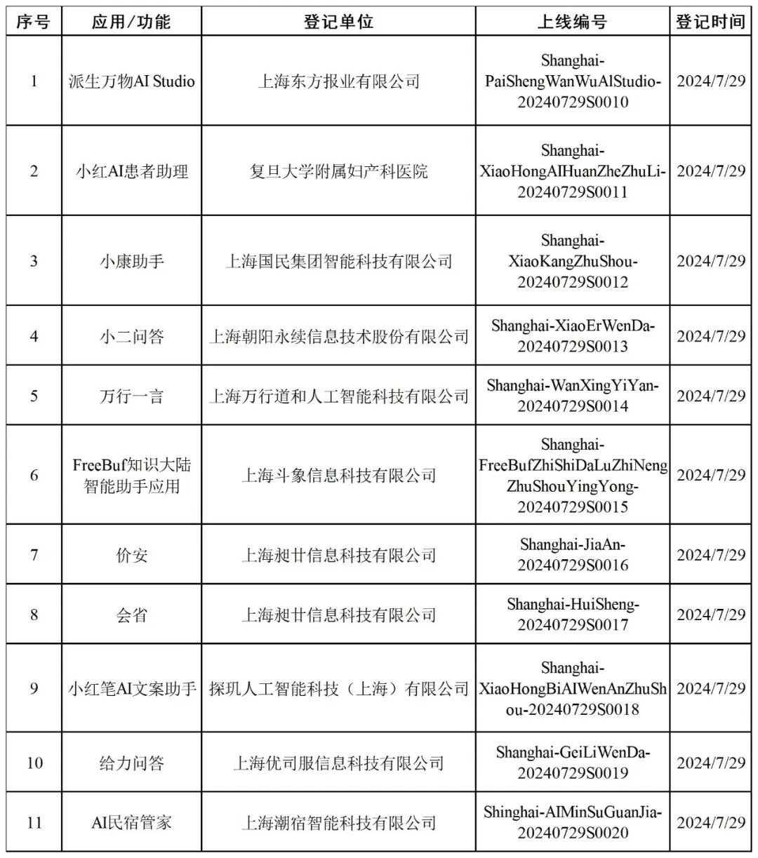 上海市生成式人工智能服务登记信息