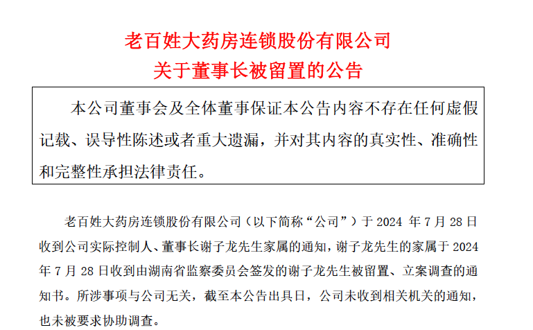 7月30日晚,老百姓发布公告,称于2024 年7月28日收到公司实际控制人、董事长谢子龙家属的通知,谢子龙的家属于7月28日收到由湖南省监察委员会签发的谢子龙先生被留置、立案调查的通知书。老百姓强调,谢子龙所涉事项与公司无关,截至本公告出具日,公司未收到相关机关的通知,也未被要求协助调查。