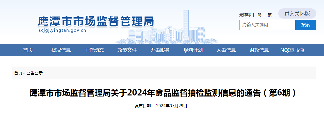 江西省鹰潭市市场监督管理局关于2024年食品监督抽检监测信息的通告(第6期)