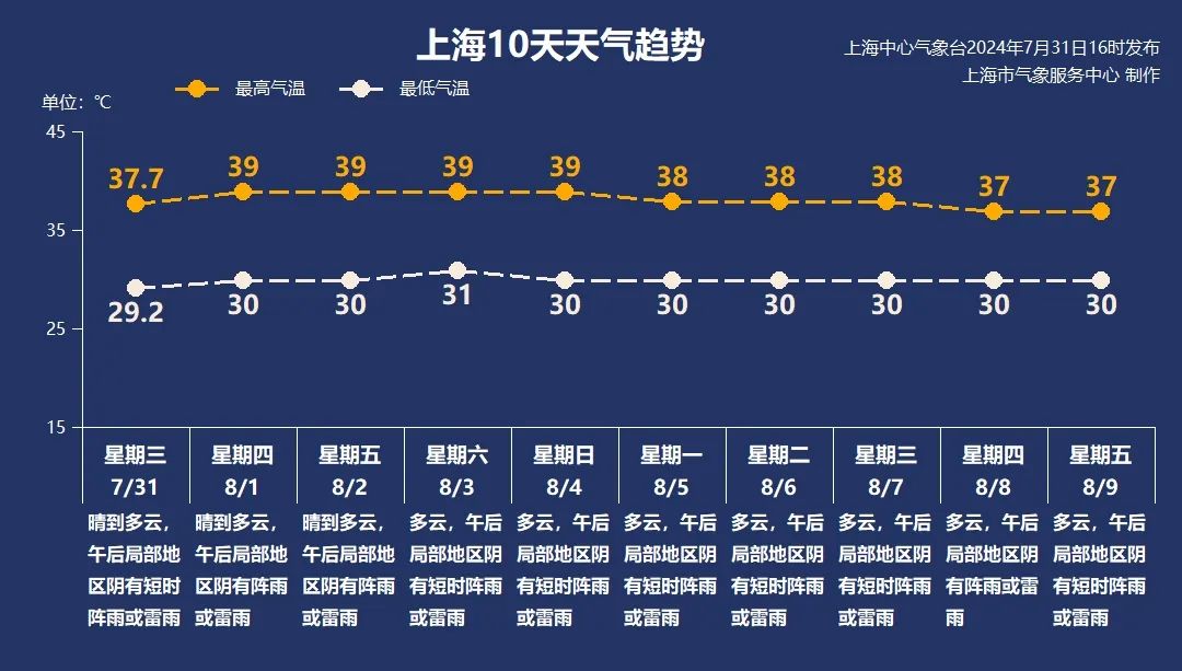 上海明起持续多日最高气温39℃左右,最低温度30℃