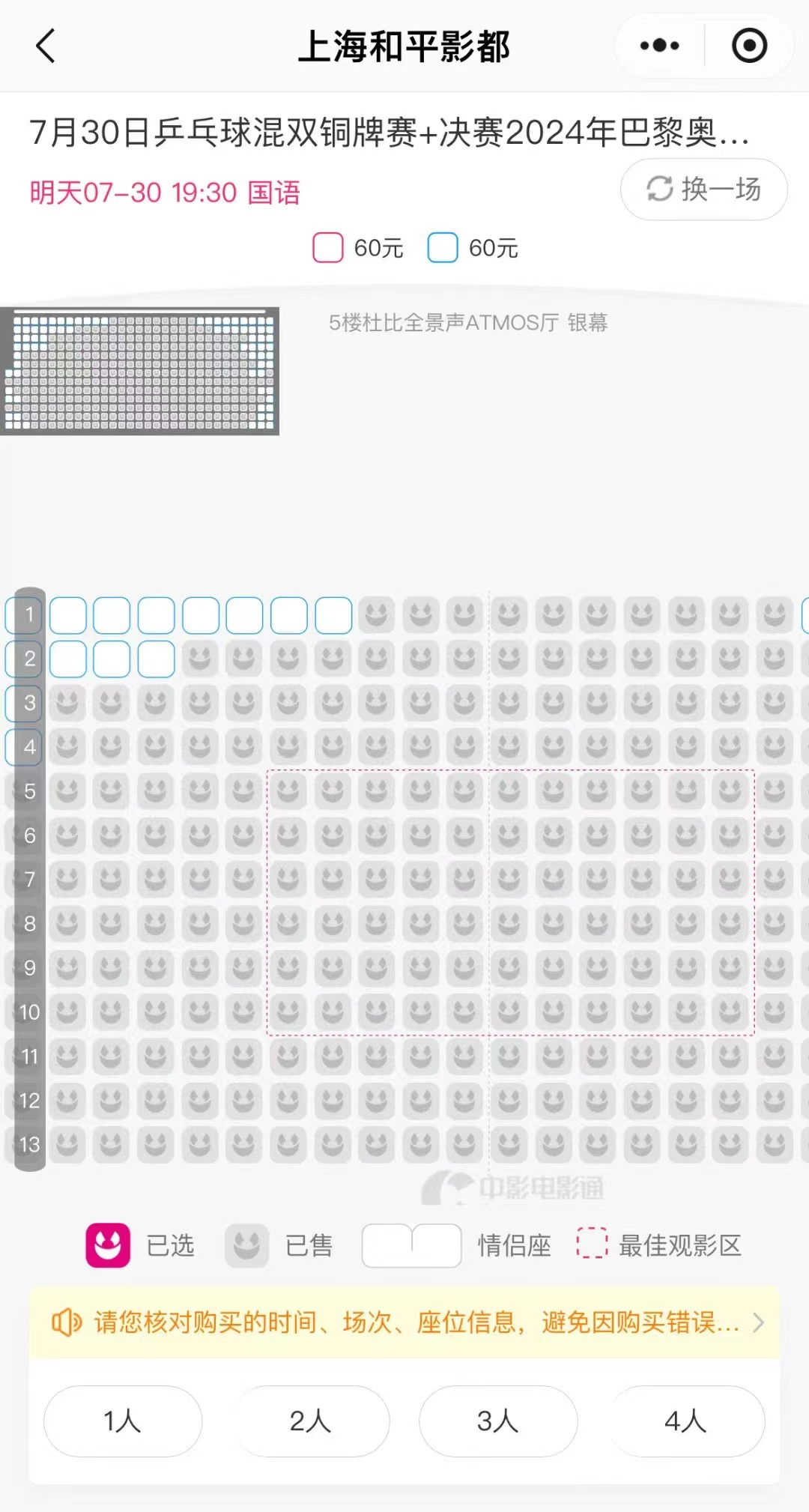 7月29日,比赛前日,和平影都巴黎奥运会乒乓球混双决赛观赛场的电影票已售出约八成。