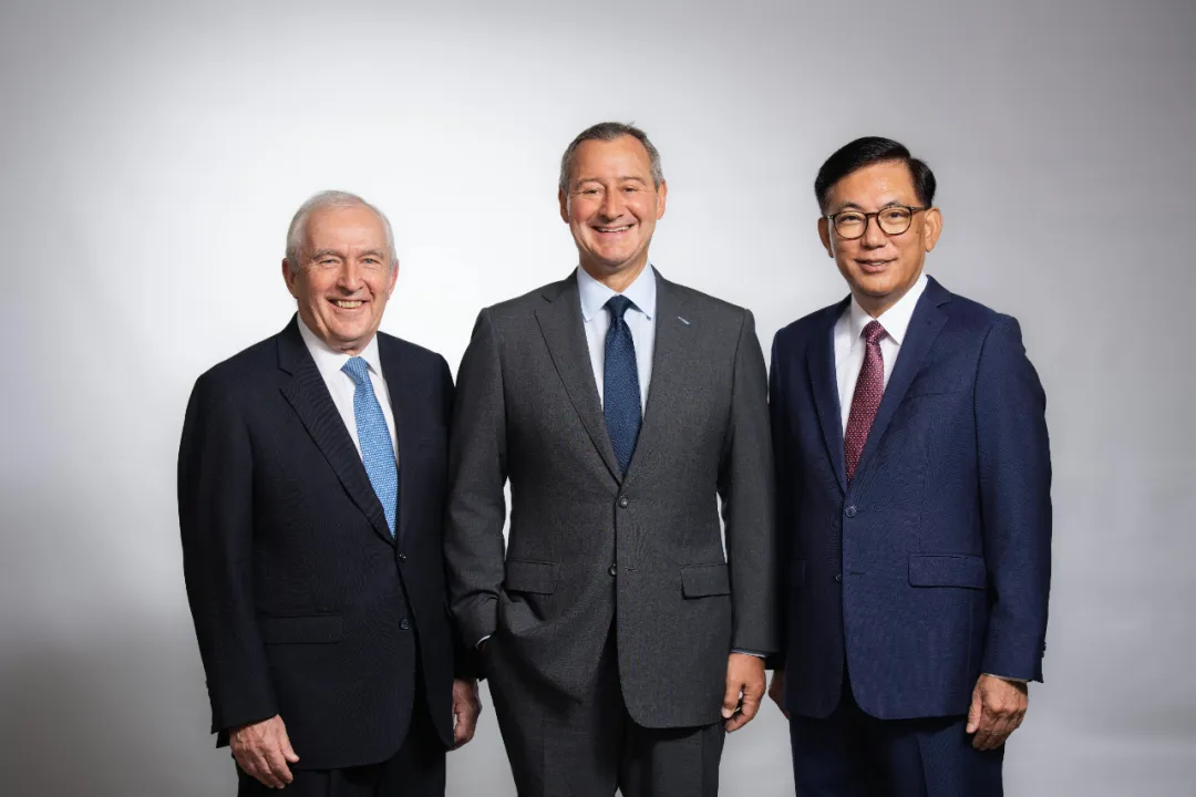 欧敦勤(中)将于2024年8月2日起接替聂雅伦(左)出任领展董事会主席。领展行政总裁王国龙(右)表示,热切期待与欧敦勤携手开展集团下一阶段增长新征程。 微信公众号@领展房地产 图