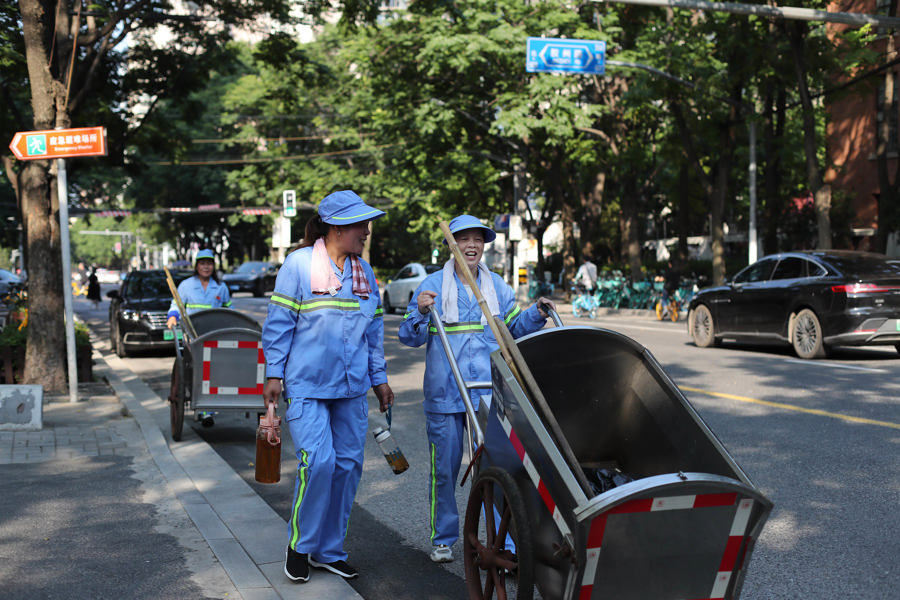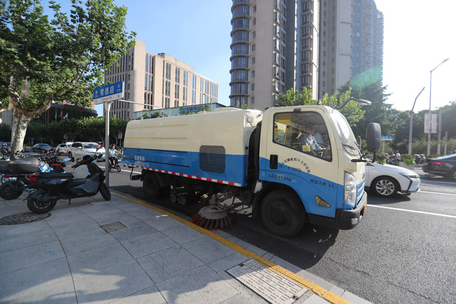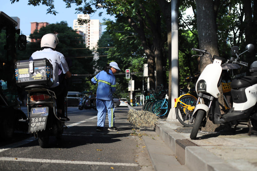 丁祥芬的清扫区域在昌平路。下午3点气温还有35摄氏度,一会儿汗水湿了衣襟。