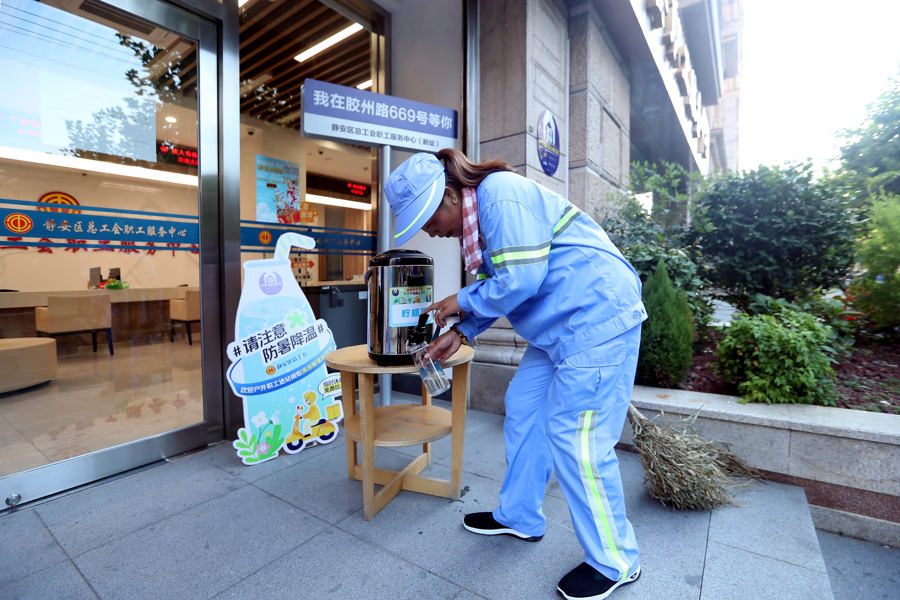 附近的静安职工服务中心户外职工爱心接力站把茶水桶放到了门外,让环卫工人、外卖小哥随取随喝,有时间了还可以到空调房里坐坐休息,吃根冷饮。