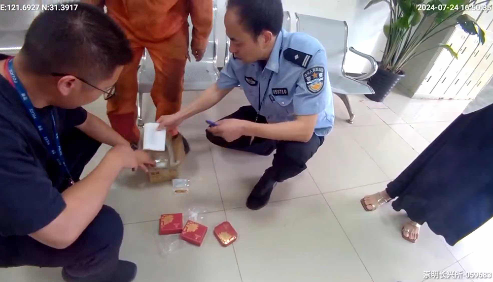 民警询问男子寄递黄金的具体情况。 上海崇明警方 供图