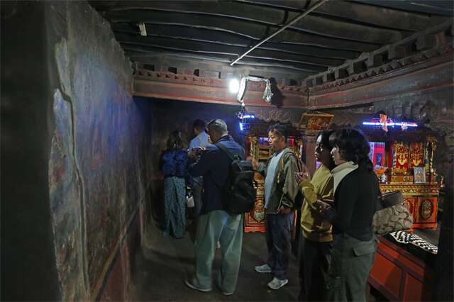 在格桑罗布老师的带队陪同下,上海大学上海美术学院数码艺术系主任李谦升及上海市公共艺术协同创新中心创新设计项目导师李依蔓带领团队调研了位于西藏日喀则地区谢通门县塔定乡门吉康民宅内的壁画。民宅内四壁墙上描绘了12幅满幅的画作,据格桑罗布老师介绍,壁画内容是雍仲苯教祖师辛饶米沃切从诞生到涅槃的十二传记,该经堂原先是苯教木氏辛家族分化后另立门户的伦珠德丹颇章府邸,西藏民主解放时候分给了普通的农户门吉康,已有400多年的历史。