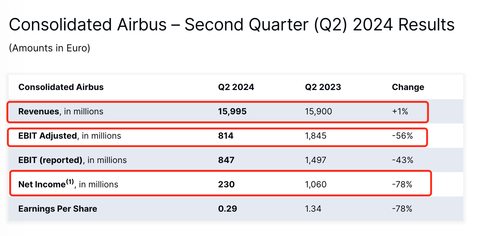 空客上半年营收为288.25亿欧元,同比增长4%;净利润为8.25亿欧元,同比下降46%;调整后息税前利润13.91亿欧元,同比下降47%。其中二季度营收超出市场预期为159.95亿欧元,与去年同期基本持平;净利润为2.3亿欧元,同比下降78%;调整后息税前利润8.14亿欧元,超出市场预期,同比下降56%,利润下滑主要与航天业务的费用有关。