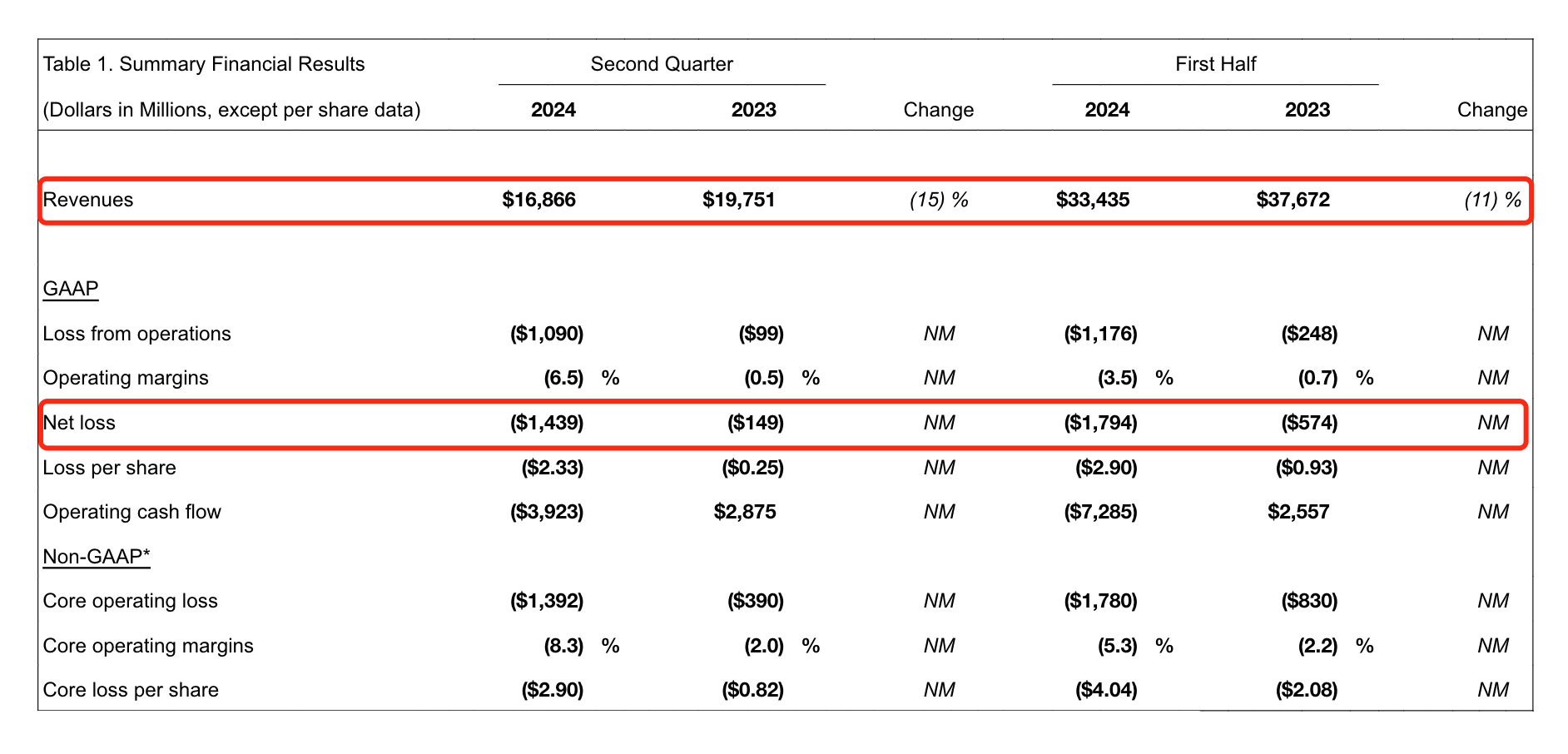 具体来看,波音上半年营收为334.35亿美元,同比下降11%;GAAP净亏损17.94亿美元,亏损同比扩大超2倍。其中二季度营收低于市场预期,为168.66亿美元,同比下降15%;GAAP净亏损14.39亿美元,亏损同比扩大超8倍。